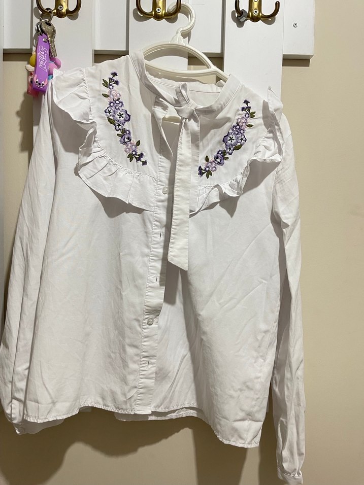 Nakışlı çiçek detaylı, beyaz pamuklu, uzun kollu, yakalı ve düğmeli, rahat kesim gömlek. Günlük sokak stili için uygundur. Bi kez giydim temizdir hiç bir yerinde bisey yoktur
