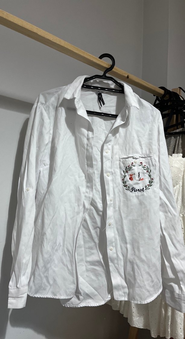Beyaz pamuklu gömlek, uzun kollu, yakalı ve cepte nakışlı detaylara sahiptir. Bol kesim ve düğmeli kapanışlıdır, günlük kullanıma uygundur.