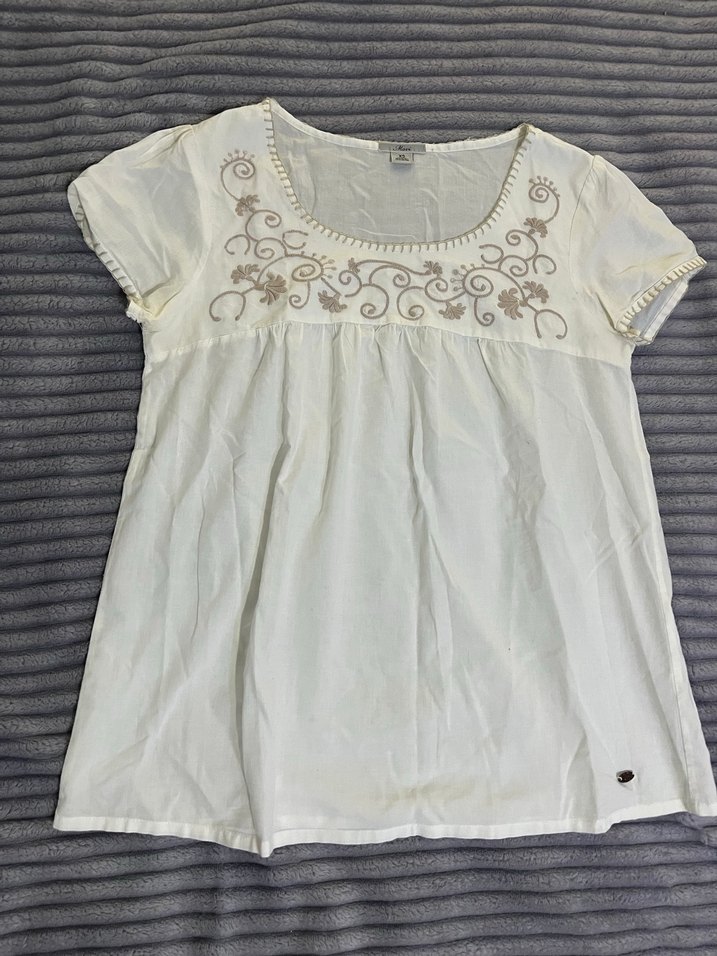 Nakışlı detaylara sahip, kısa kollu, bol kesim beyaz pamuklu bluz, bohem tarzını yansıtır, günlük kullanıma uygundur. Xs ve s beden uyumludur mavi markasının bluzu.