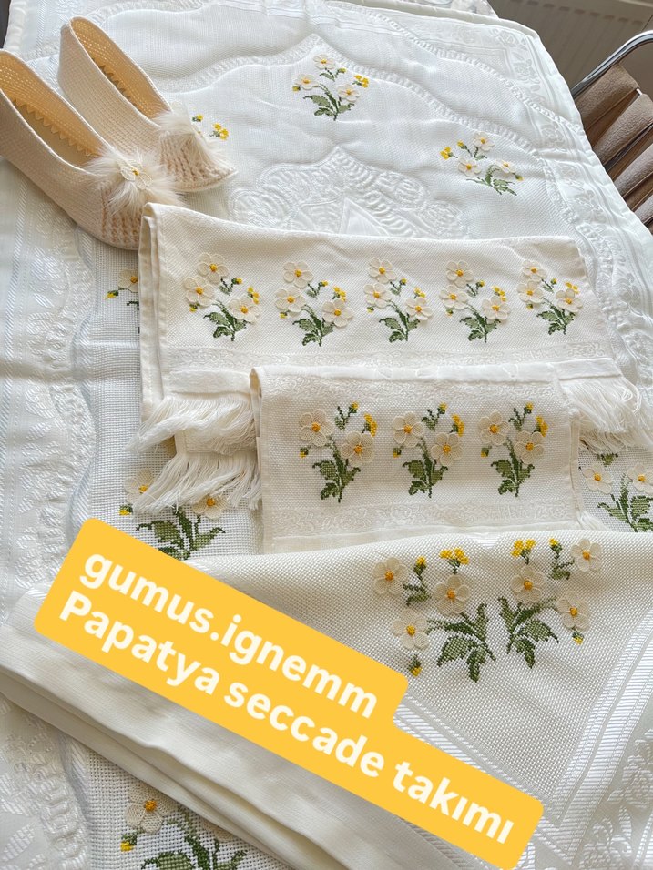 Nakışlı papatya desenleriyle süslenmiş beyaz seccade takımı, yumuşak ve klasik dokudadır. Birden fazla parçadan oluşur ve detaylı çiçek işlemeleri içerir.