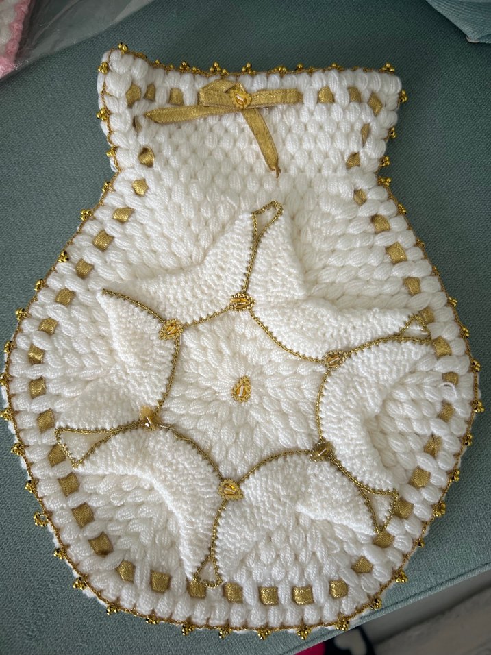 Beyaz nakışlı kumaş ve parlak altın detaylara sahip bebek önlüğü, yumuşak ve konforludur. Adet fiyatıdır…