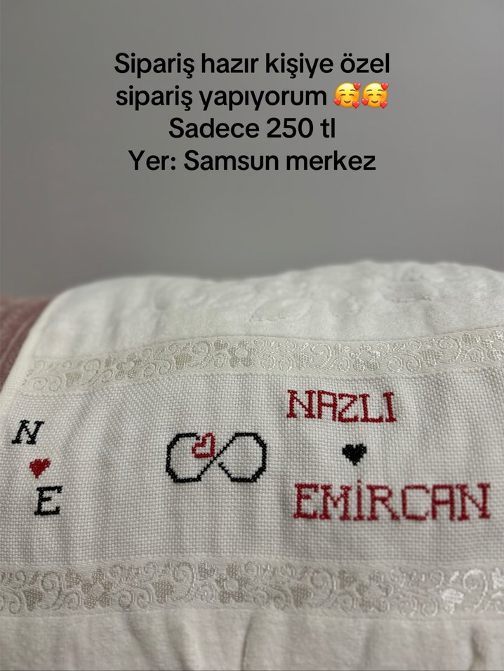 İsimler ve sembollerle detaylı nakış işçiliğine sahip, parlak beyaz kumaştan havlu kişiye özel yapıyorum