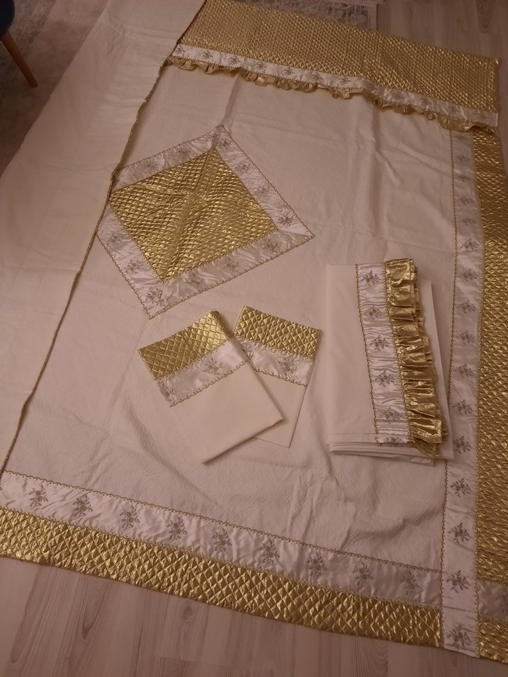 Parlak altın nakışlı detaylara sahip beyaz pike takımı ve uyumlu yastık kılıfları, zarif dekoratif desenlerle süslenmiştir. ️