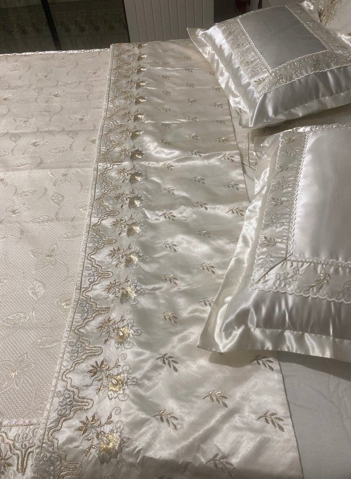 Nakışlı Beyaz Parlak Yatak Örtüsü