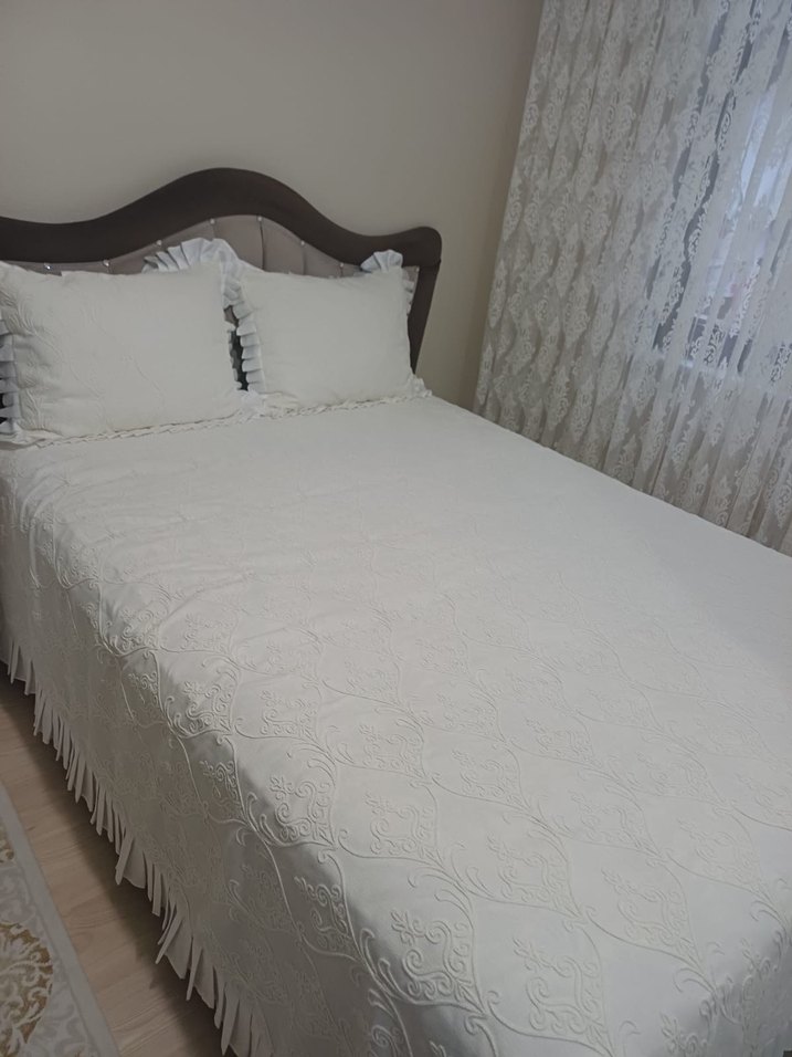 pile detaylı zarif nakış desenlerine sahip krem yatak örtüsü, uyumlu yastık kılıfları ile tamamlanmıştır. ️