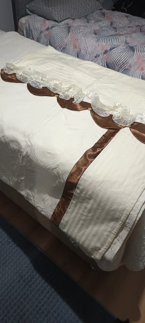 Nakışlı desenlere ve parlak kahverengi kurdele detaylarına sahip beyaz yatak örtüsü, zarif fırfırlı kenar ile tamamlanmıştır. ️