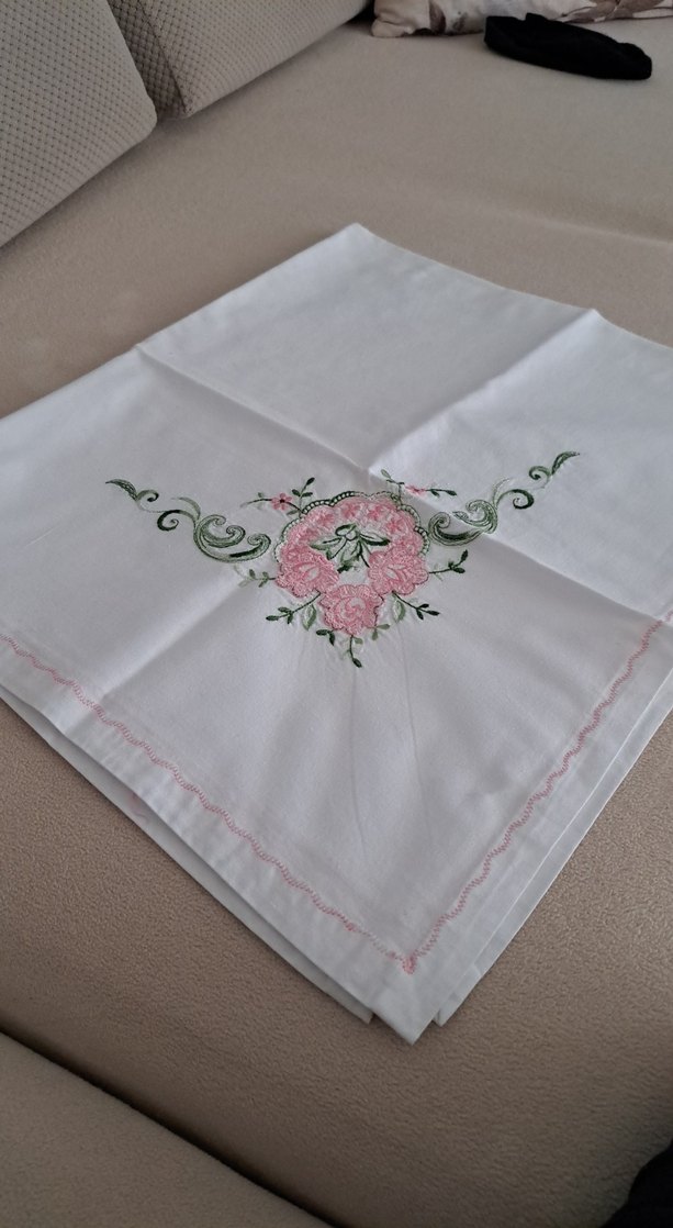 Pastel pembe ve yeşil nakışlı çiçek desenli beyaz zarif kenar detayı ile. Geleneksel ortamlara uygun yumuşak kumaş. Bir kere kullanıldı