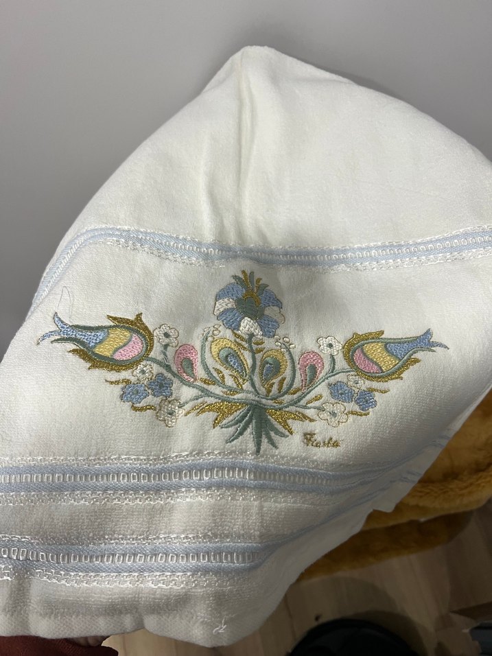 Bu beyaz havlu, pastel renklerde nakışlı çiçek ve kuş desenine sahip, geleneksel tarzda ve zarif dokulu kenarlıklara sahiptir. ️
