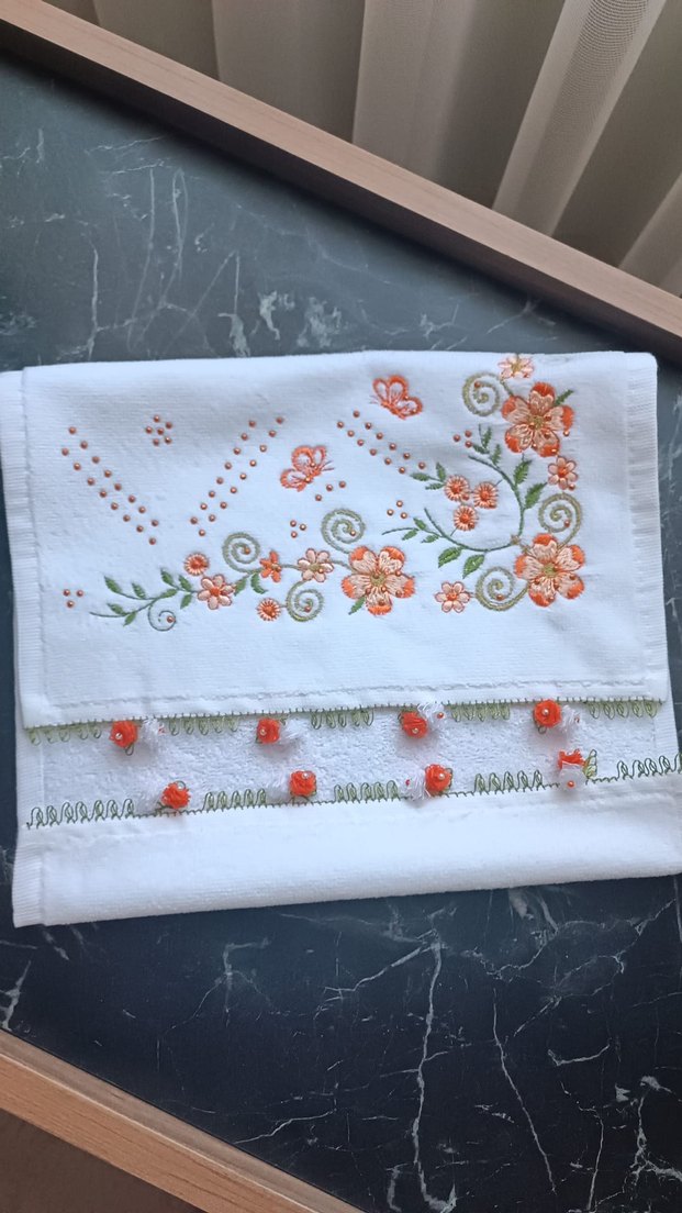 Bu beyaz havlu, pastel renklerde çiçek ve kelebek nakışları ile süslenmiş, kenarları küçük kumaş çiçeklerle dekoratif detaylara sahip.