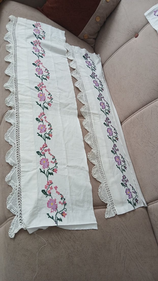 Nakışlı çiçek desenleri ve dantel kenarlarıyla beyaz, pastel renklerde geleneksel masa örtüsü.
