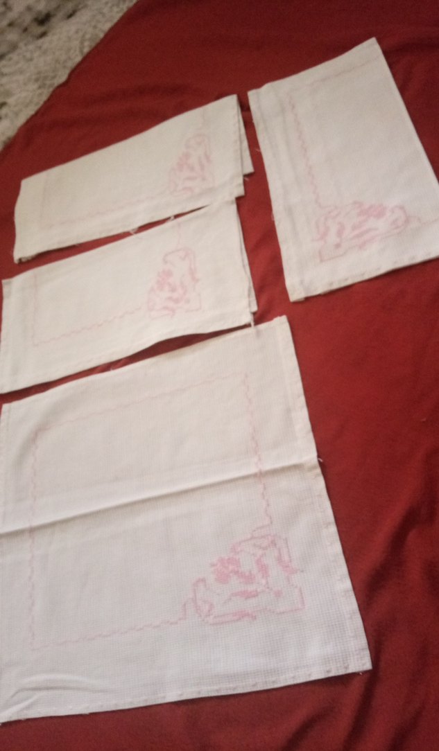Nakışlı, pastel pembe desenlere sahip beyaz masa örtüsü takımı, geleneksel tarzıyla masanıza zarif bir dokunuş katar. ️etamin işleme. 4 tane var mutfak rafı örtüsü olarak kullanılmış