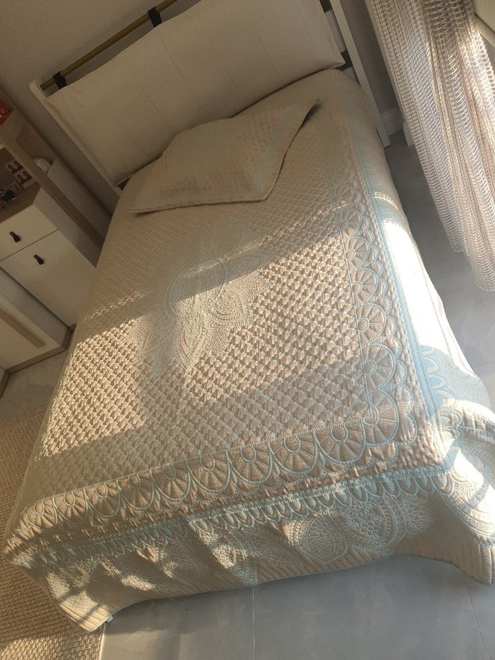 Pastel tonlarda, detaylı nakış desenleriyle süslenmiş beyaz yatak örtüsü. taç mağazasından alınmıştır