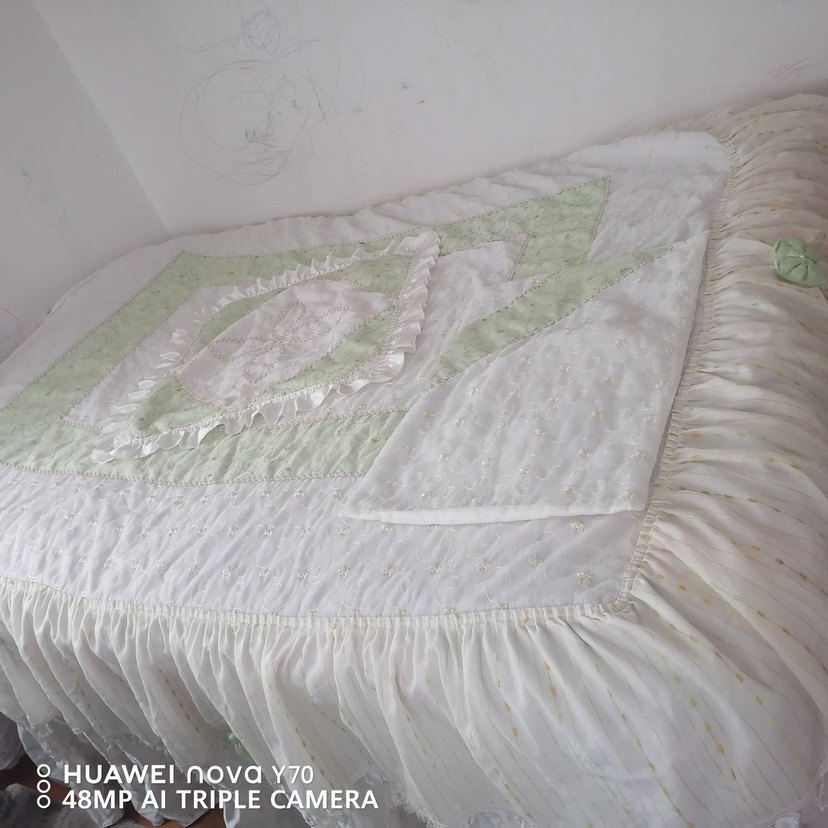 Pastel nakışlı, beyaz renkli ve ince pileli kenar detaylarına sahip yatak örtüsü. ️