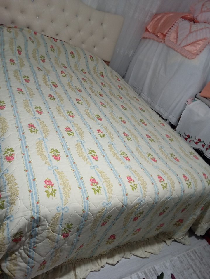 Nakışlı çiçek desenleriyle beyaz zemin üzerinde pastel tonlarda yumuşak ve şık bir yatak örtüsü. sfır ürün resimdeknden daha güzel