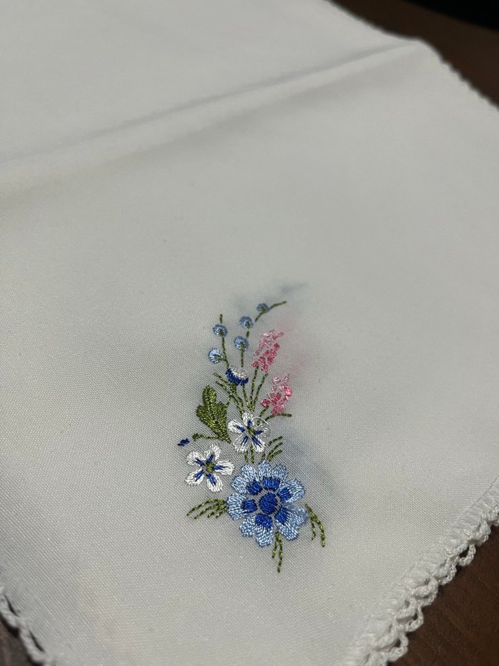 Pastel renklerde çiçek nakışlı, geleneksel tarzda 6 adet peçete. Kenarları ince dantel detaylıdır.