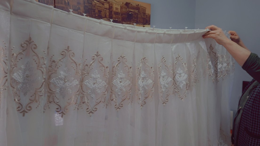 Parlak, nakışlı desenlere sahip beyaz perde, klasik tarzda şıklık katıyor.