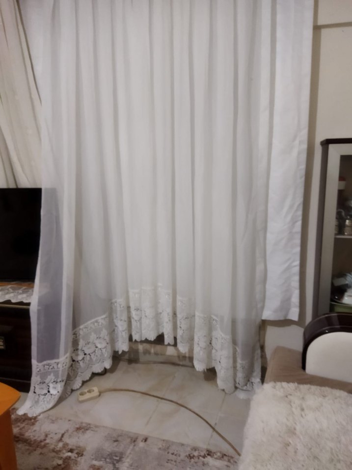 Alt kısmında zarif nakış detayları bulunan beyaz klasik perde, şık ve sade bir görünüm sunar. ölçü sorabilirsiniz
