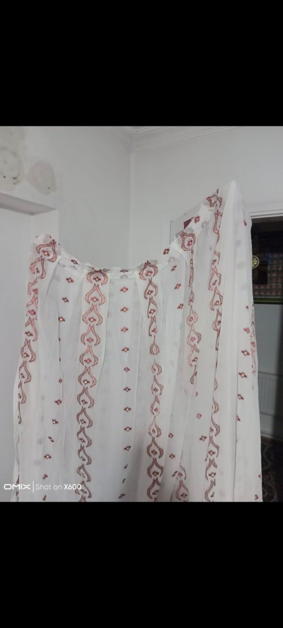 Bu beyaz perde, hafif tonlarda nakışlı desenleriyle geleneksel bir stile sahiptir ve her odaya zarif bir dokunuş katar.
