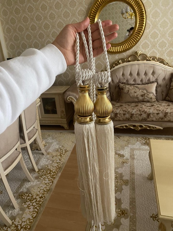 Nakışlı detaylara sahip beyaz perde bağlama ipi, kıvrımlı ip ve süslü püsküller içerir. Klasik perde modelleri için uygundur.