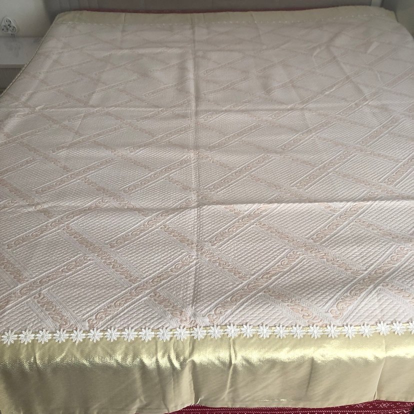 2.25+205 CM.Nakışlı desenlere sahip beyaz yatak örtüsü, pastel renkte kenar süslemeleri ve ince çiçek nakışı içerir. ️