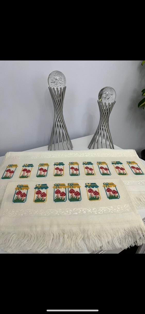 Nakışlı mantar desenleri ve püsküllü kenarlarıyla beyaz, hafif dokulu geleneksel havlu.
