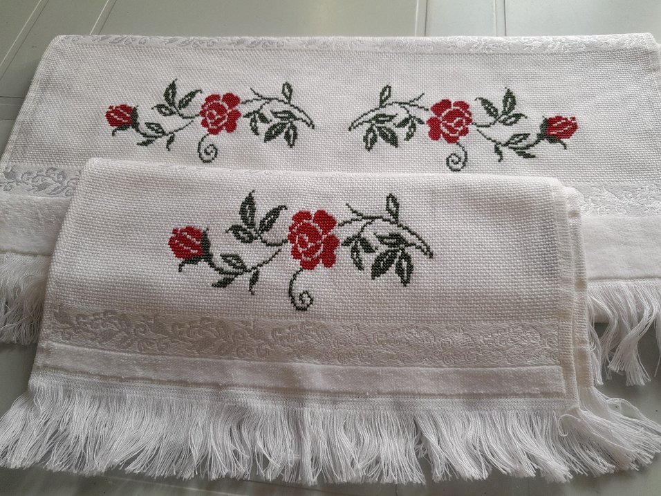 Renkli nakışlı çiçek desenleri ve püsküllü kenarları olan beyaz havlu. Geleneksel tarzda detaylı işçiliğe sahiptir.