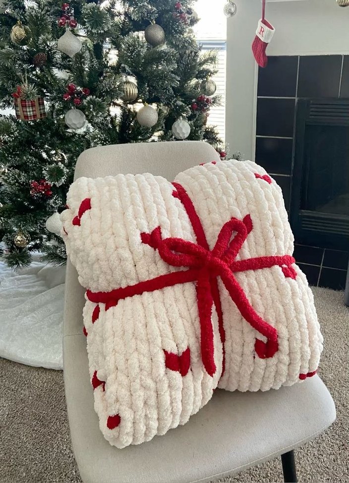 Bu beyaz battaniye, renkli nakış detaylarına ve yumuşak dokulu kumaşa sahiptir, kırmızı iplikle bağlanmıştır.