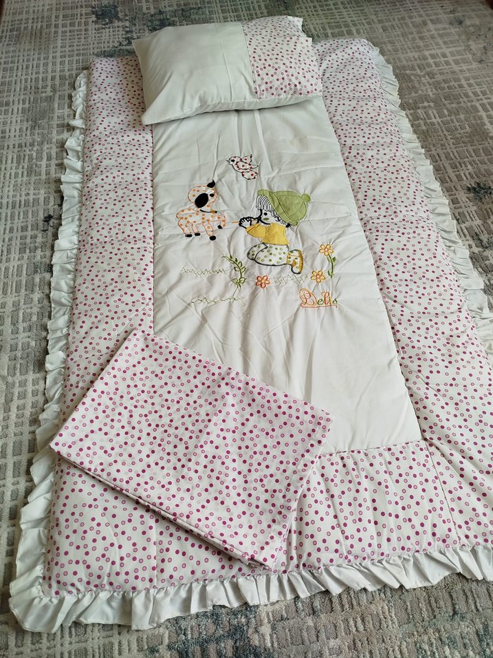 Çocuklar için beyaz sentetik kumaştan yapılmış, renkli nakışlı hayvan desenleri bulunan, pembe puantiyeli bordürlü yastık ve yorgan seti. ️