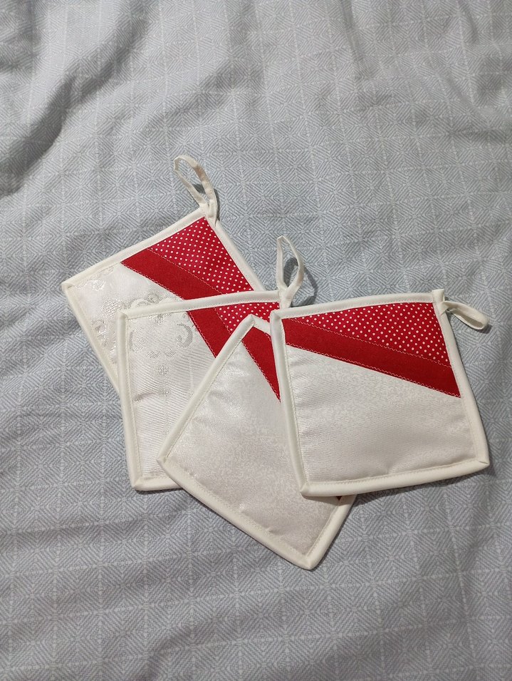 Renkli nakış detaylı ve kırmızı şeritli beyaz fırın eldiveni seti, mutfakta kullanıma uygundur.