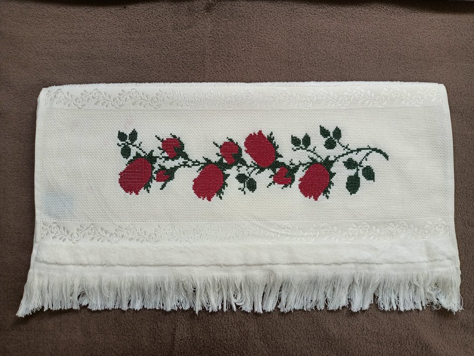 Beyaz renkte, nakışlı renkli çiçek desenleri ve püsküllü süslemeye sahip geleneksel tarzda havlu.