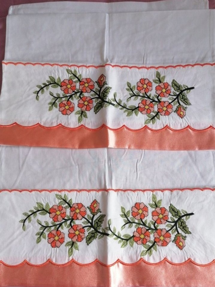 Renkli çiçek nakışlı, beyaz zemin üzerine turuncu dalgalı kenarlıklı geleneksel yatak örtüsü pike takımı