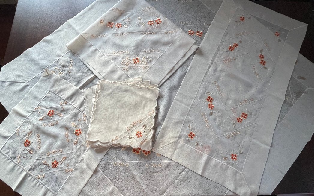 12 adet peçete. 4 büyük parça. (2 masa örtüsü, 1 runer, 1 kare örtü)