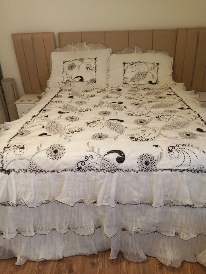 Koyu renk nakışlı desenlere sahip beyaz yatak örtüsü, yumuşak kumaş ve zarif fırfır detayları içerir. ️ufak bir sarı leke var, geçer sanıyorum, kapalı kaldığı için olmuş muhtemelen, nerdeyse hiç kullanmadım, yatak odam gold detaylı, bu gümüş işlemeli, o yüzden satıyorum, fiyatı uygun tuttum. fotoda belli değil, canlı güzel, gümüş sim işlemeli.