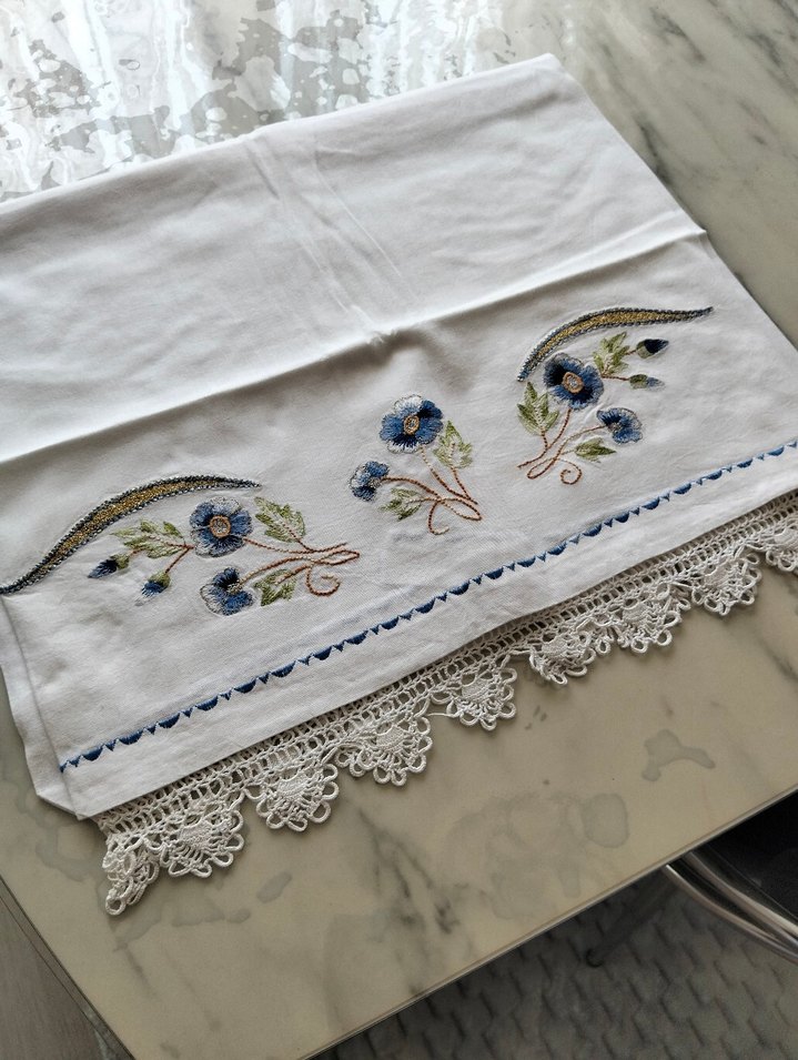 Nakışlı mavi çiçek desenleri ve ince dantel kenarı sıfır yastık