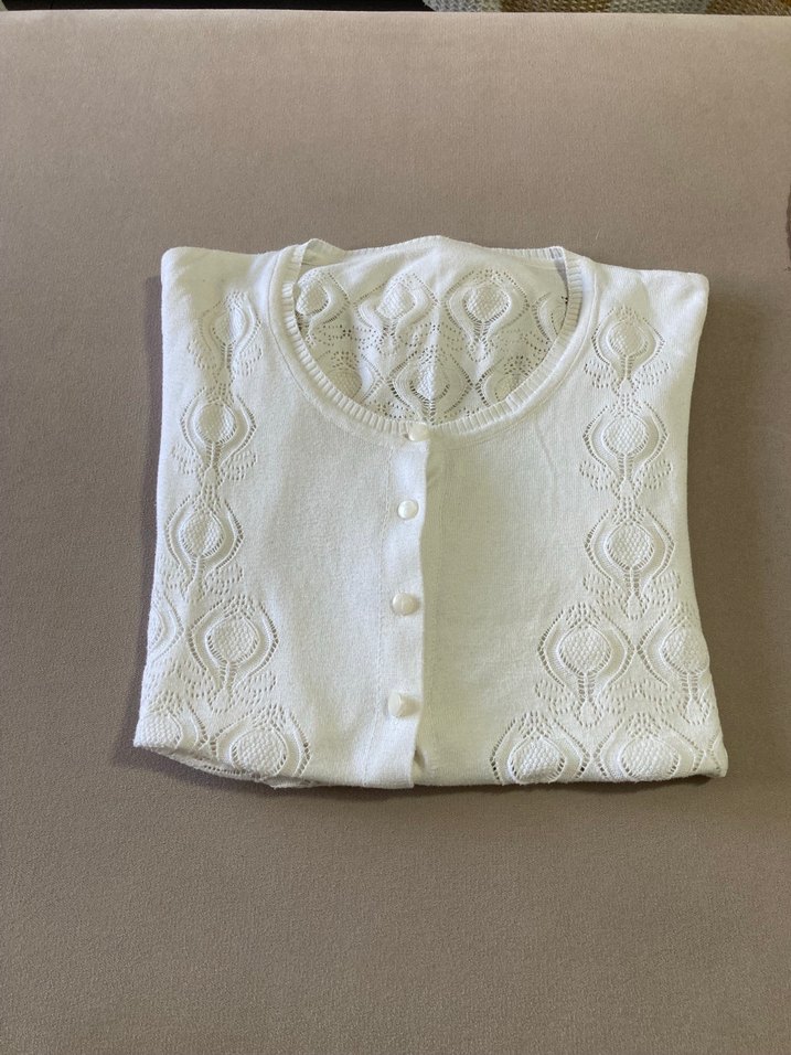 Düğmeli, nakışlı desenli beyaz uzun kollu, yuvarlak yaka kadın hırka, normal boyda ve dar kesimdir.