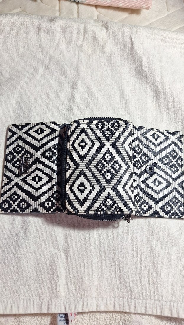 Nakışlı desenlere sahip, kemerli tasarımlı beyaz ve siyah bohem kadın cüzdanı. Sentetik kumaştan yapılmıştır, günlük kullanım için uygundur.