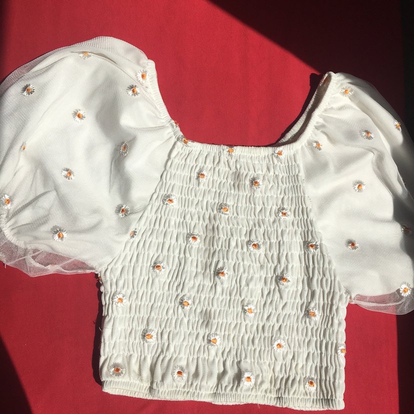 Nakışlı çiçek desenli, straplez yakalı, kısa kollu ve fırfırlı beyaz mini bluz. Yumuşak sentetik kumaştan, 1kere giyildi tertemiz