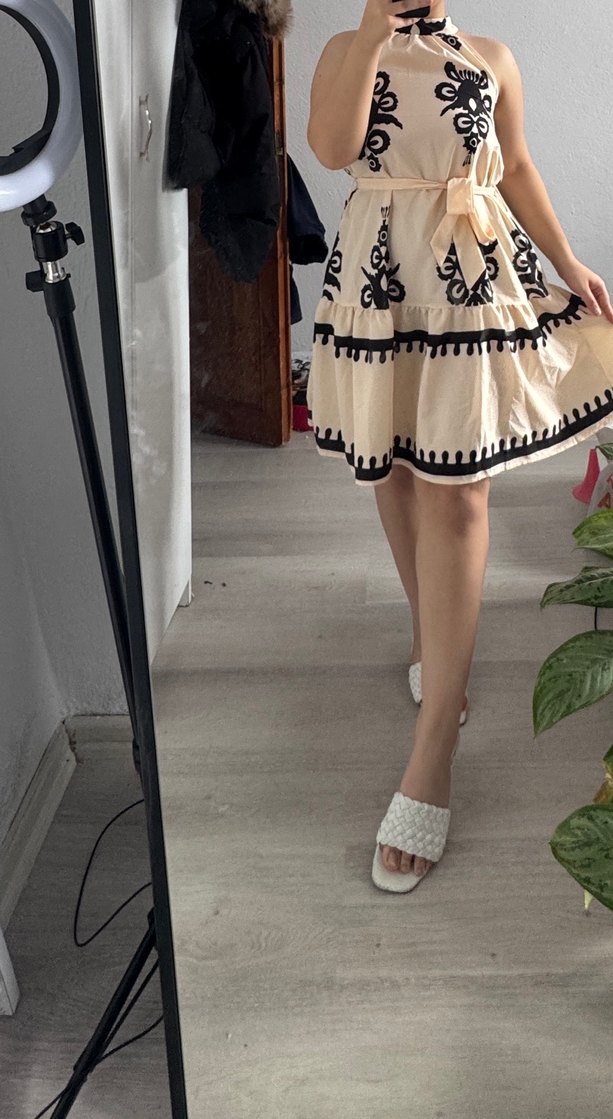 Nakışlı desenlere ve fırfır detaylara sahip beyaz straplez mini elbise. Bol kesim ve askılı kollu, bohem tarzına uygun. Sentetik kumaştan, günlük kullanım için ideal.