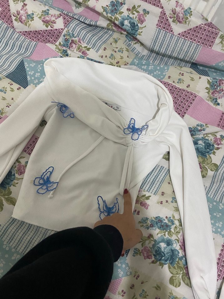Uzun kollu, straplez beyaz bluz, mavi nakışlı kelebek desenleri ile süslenmiştir. Düğmeli ve rahat sentetik kumaştan, günlük kullanıma uygundur.