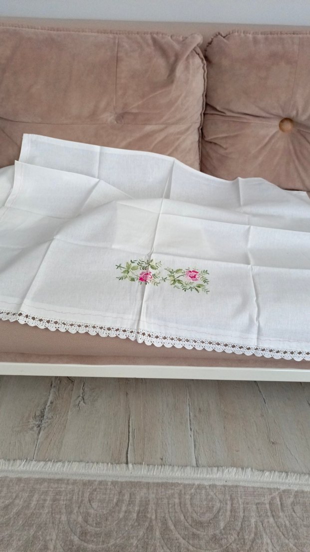 Pastel renklerde çiçek nakışlı, Kenarları ince dantel detaylı, geleneksel tarzda ve yumuşak dokulu.