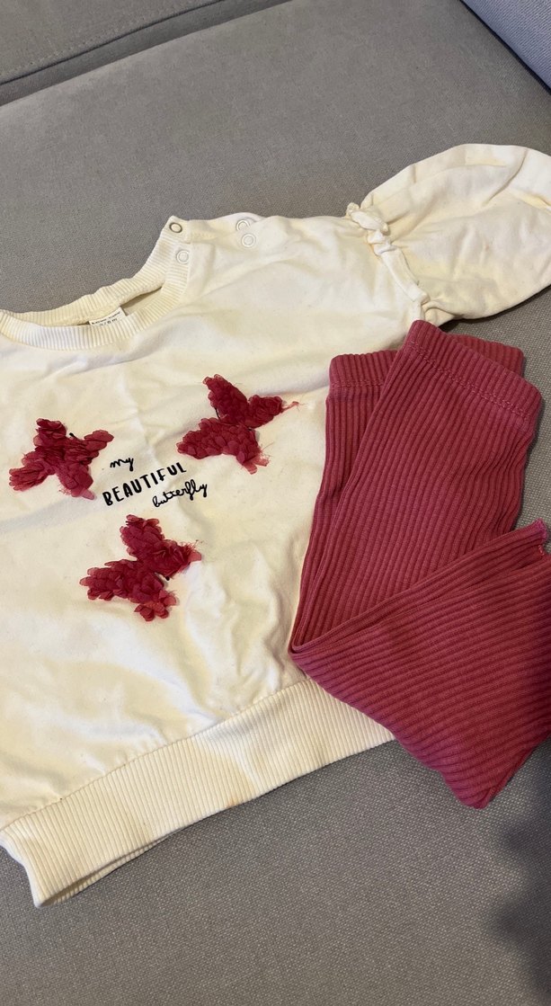 Nakışlı pembe kelebek detaylı beyaz uzun kollu üst ve yumuşak pembe fitilli pantolondan oluşan bebek kız takımı.