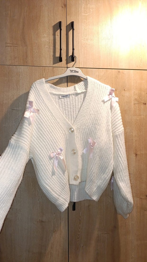 Nakışlı detaylara sahip beyaz, uzun kollu, V yakalı triko hırka. Rahat ve salaş kesimiyle konforlu bir şıklık sunar.