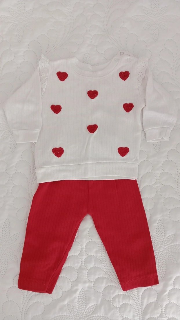Nakışlı renkli kalplerle süslenmiş beyaz triko uzun kollu üst ve kırmızı pantolonlu bebek kıyafet takımı. Rahat ve şık. ❤️