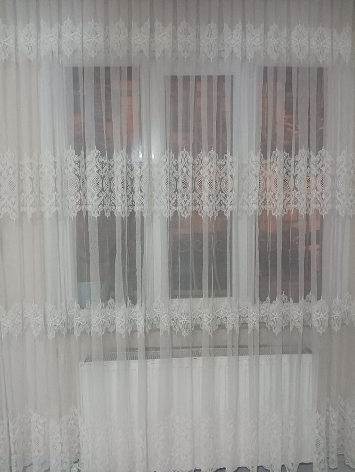 Nakışlı desenlere sahip beyaz tül perde, hafif ve şık bir görünüm sunar. pencere dekorasyonuna uygundur. çok az kullanmış herhangi bir deposu sorun yok tacın markası sık pileli beni 3 metre boyu 2 metre 40 santim