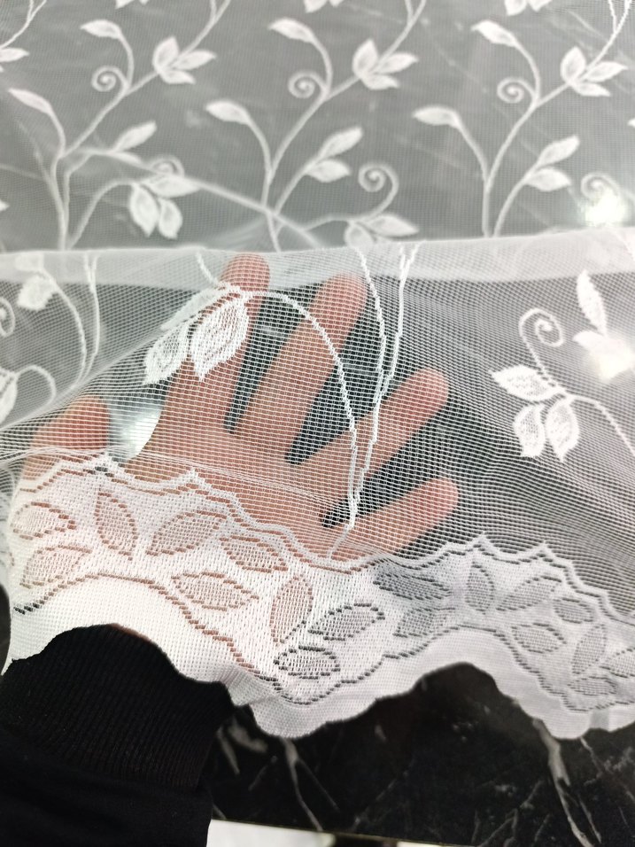 Hafif beyaz renkli, nakışlı çiçek desenleri ve dalgalı kenarları olan şeffaf tül perde. en 305 boy 200