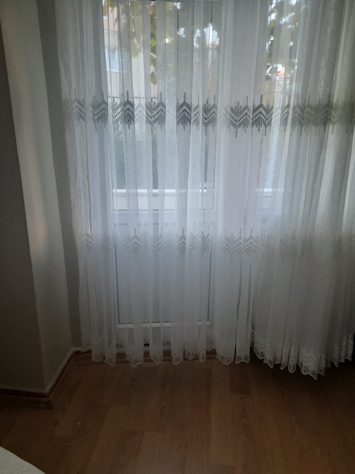 Gri nakışlı desenlere sahip beyaz tül perde, klasik ve zarif bir görünüm sunar. kullanılmadı En 3.5 metre Boy 2.5 metre