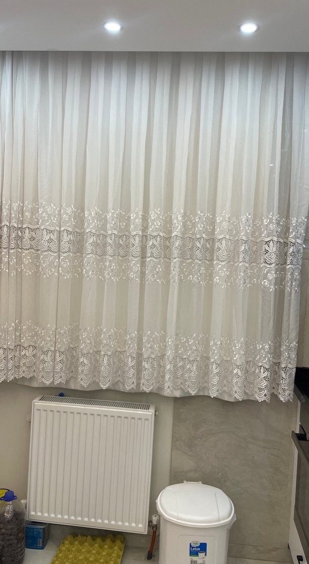 Hafif nakışlı beyaz tül perde, klasik tasarımıyla her odaya zarafet katıyor. Boyu 170 cm eni 3 45 cm az kullanıldı ev deyişdirdigim için camlarıma uymadı en ufak bir sıkıntısı yok