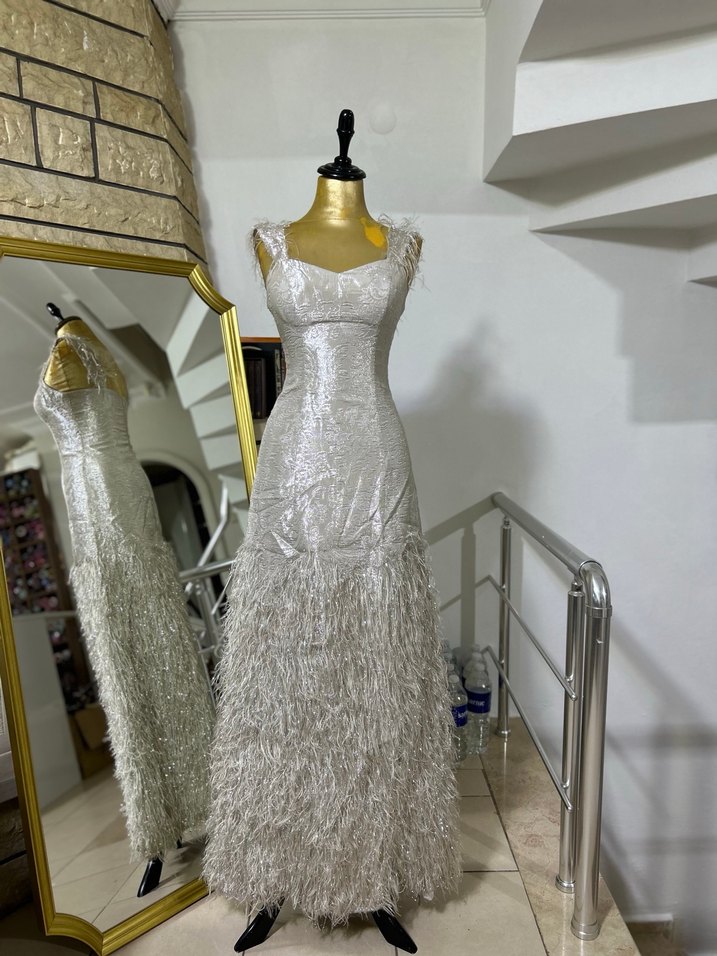 Nakışlı detaylara sahip beyaz, uzun nişan elbisesi. Askısız ve kolsuz tasarımı modern klasik ve göz alıcı bir şıklık sunar. Dökümlü ve rahat kesimlidir. 34-36-38 bedenler için uygundur.