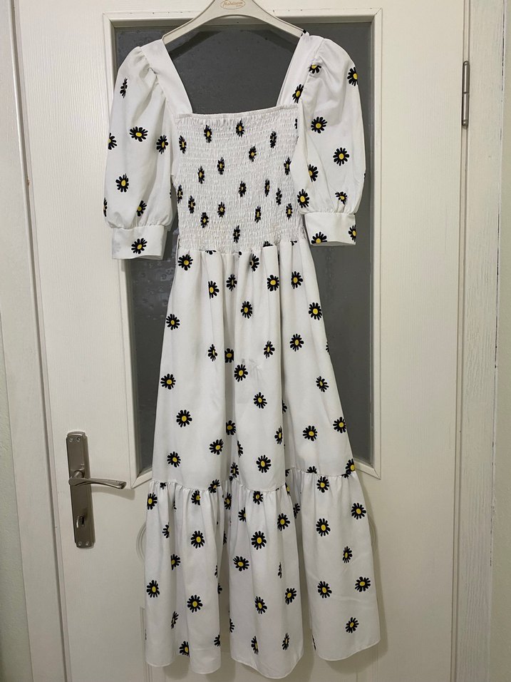 Nakışlı çiçek desenli beyaz uzun elbise, tekne yaka, balon kollu ve fırfırlı detaylara sahiptir. Bol kesim ve bohem tarzıyla günlük kullanıma uygundur. 2. Fotoğrafta belirttiğim gibi yanık var ama eteğin fırfırlarından belli olmuyor
