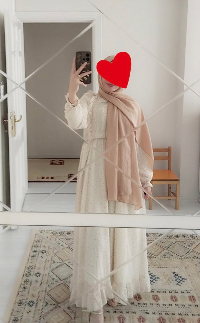 Nakış işlemeli, yüksek yakalı ve uzun kollu beyaz uzun elbise. Hafif sentetik kumaştan, bol ve şeffaf tasarıma sahip, günlük kullanım için uygun.